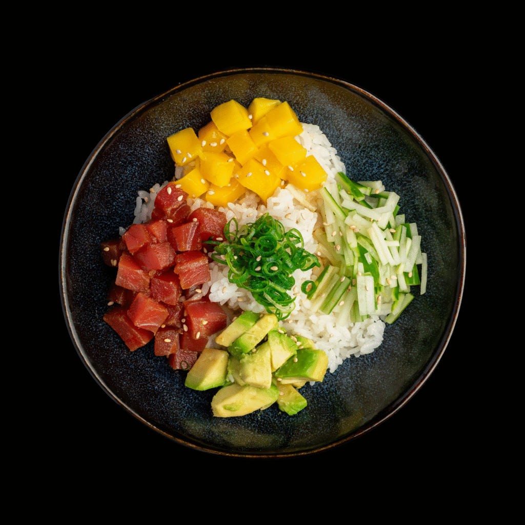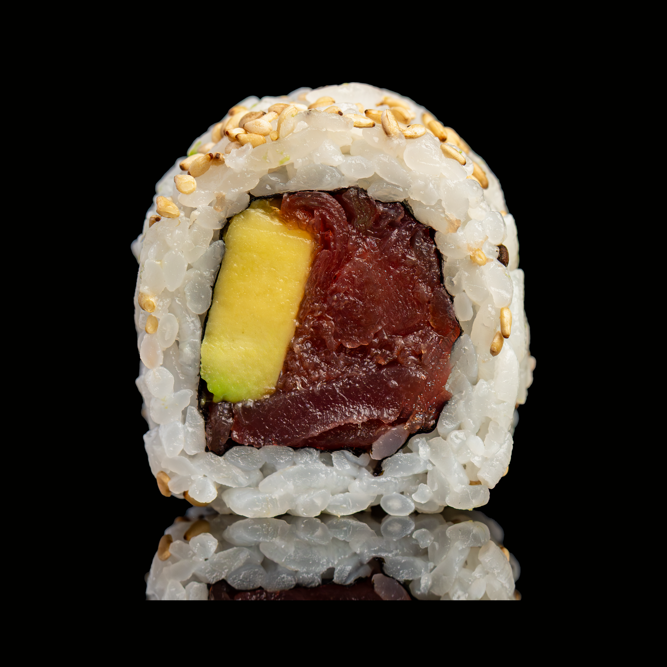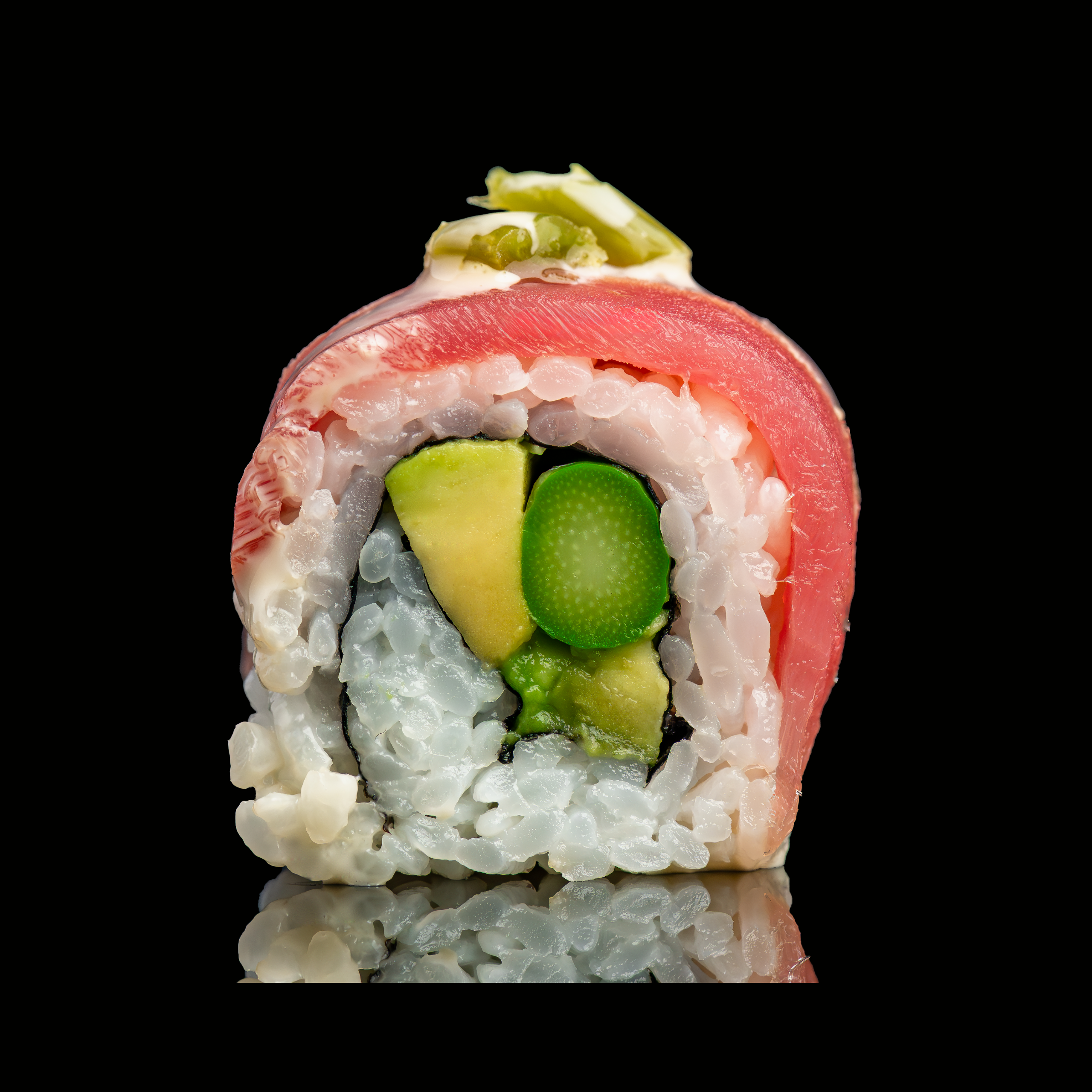 Ingrediente: orez sushi, ton, avocado, castraveți, ceapă verde, mango, ghimbir, soya, susan