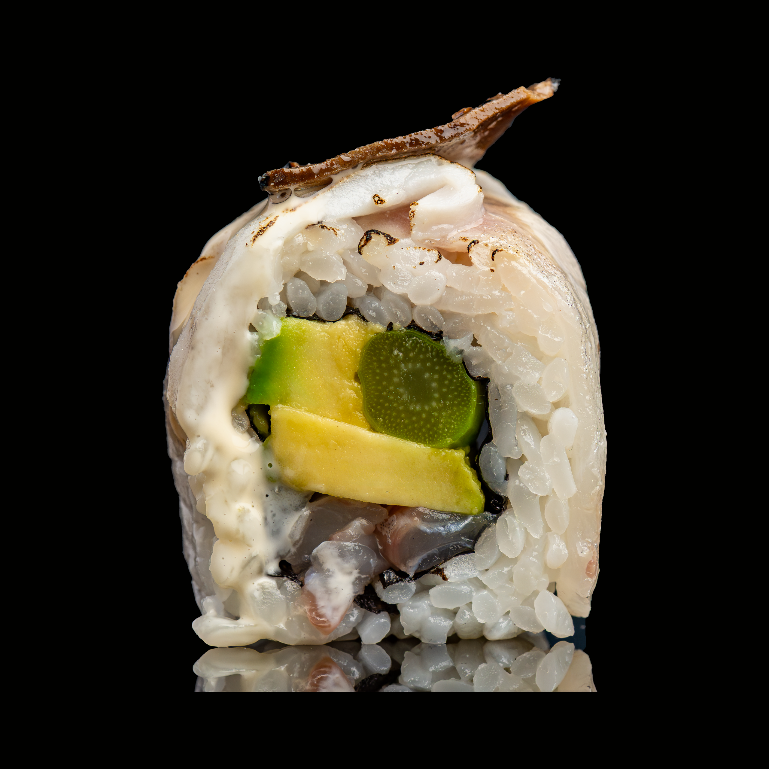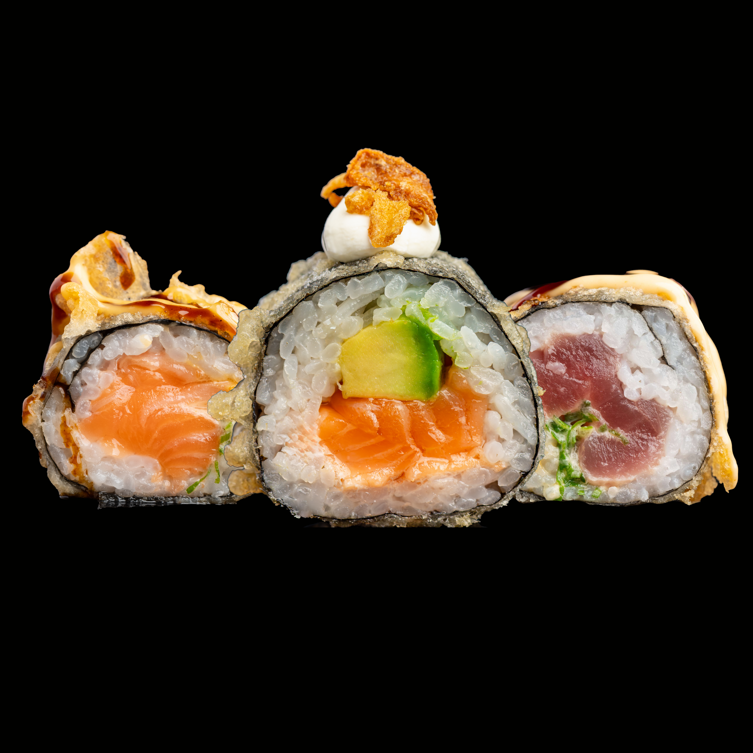 Ingrediente: orez sushi somon, biban, avocado, castraveți, mango, spicy mayo, sos unagi, ceapă verde, ceapă crocantă