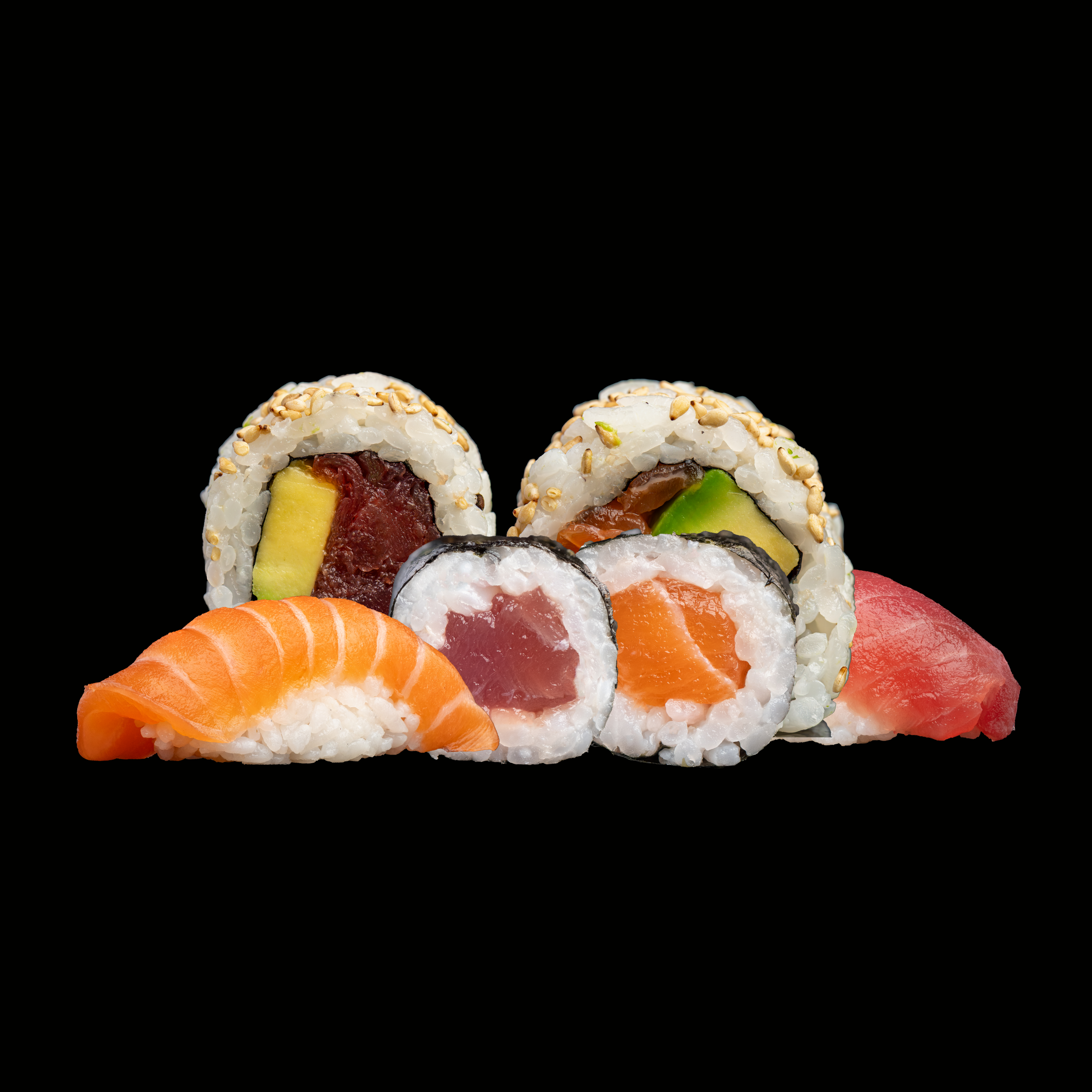somon, ton și biban flambat, avocado, castraveți, sos picant, ceapă verde ulei trufe, icre tobiko susan