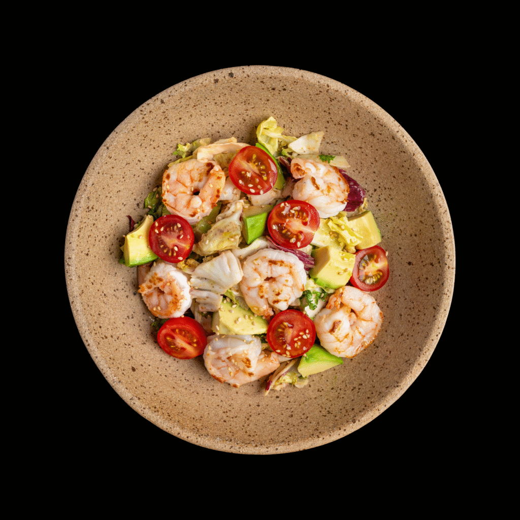 Ingrediente: mix de salată, avocado, roșii cherry, creveți, dressing de susan