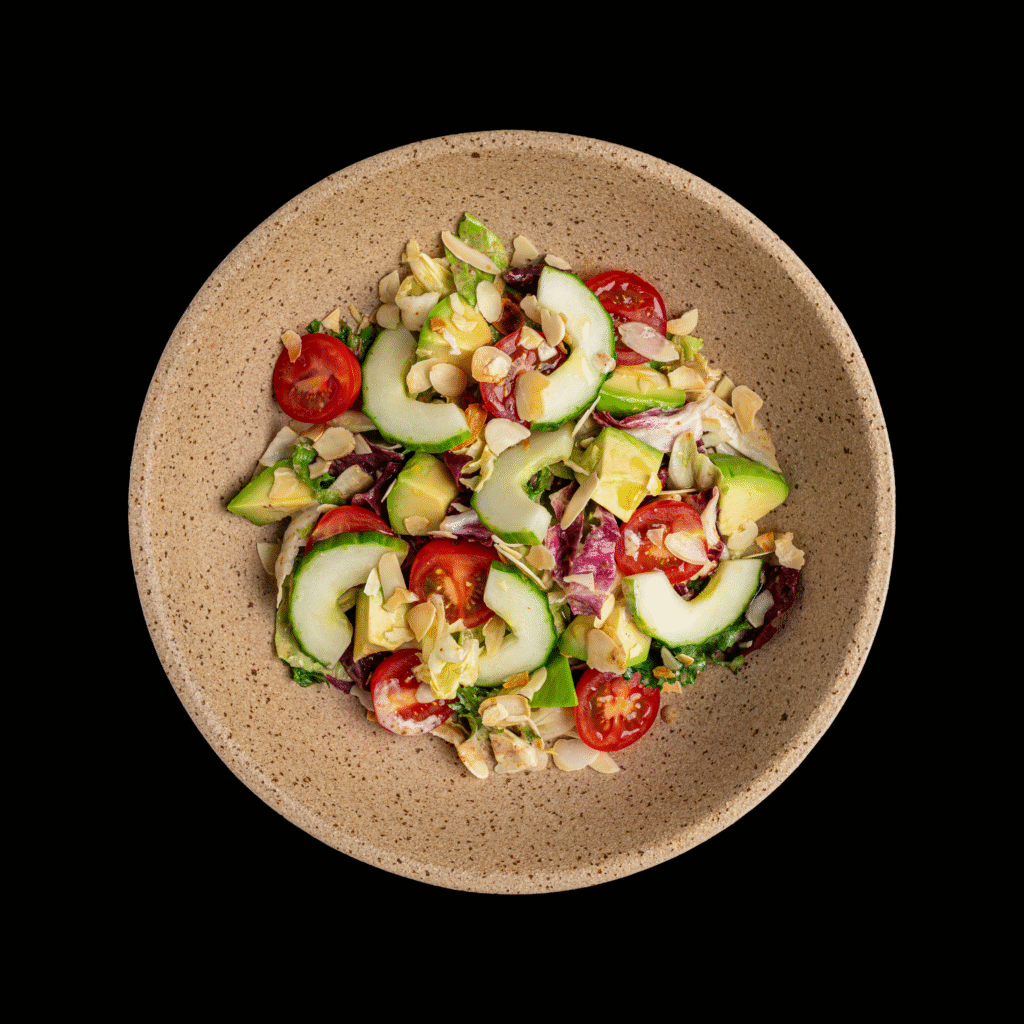 Ingrediente: mix de salată, avocado, roșii cherry, castraveți, dressing de susan, fulgi de migdale