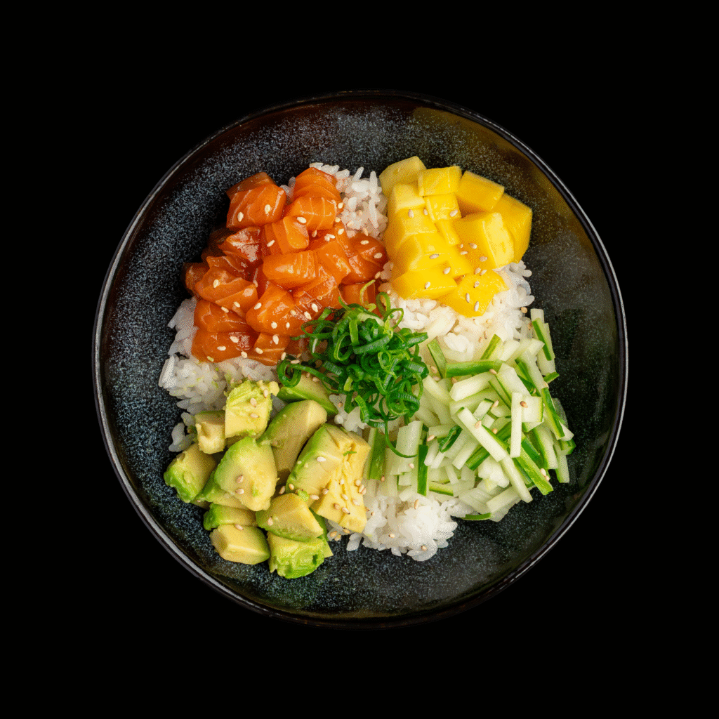 Ingrediente: orez sushi, somon, avocado, castraveți, ceapă verde,  mango, ghimbir, soya, susan